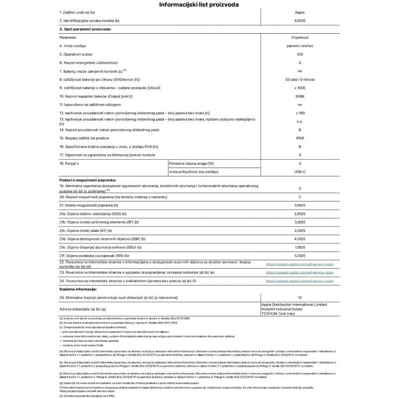 EU Oznaka: Energetski razred A Otpornost na pad: Klasa B (180 padova) Popravljivost: Klasa C